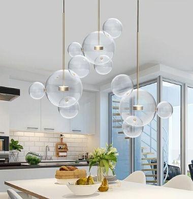 Nad wyspę kuchenną najczęściej wybieramy lampy wiszące podłużne, które oświetlają blat ciągłą linią, podłużne, które są jakby połączeniem mniejszych lamp lub pojedyncze mniejsze lampy oświetlające blat punktowo.