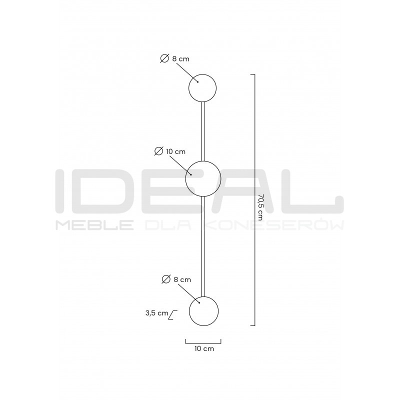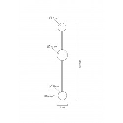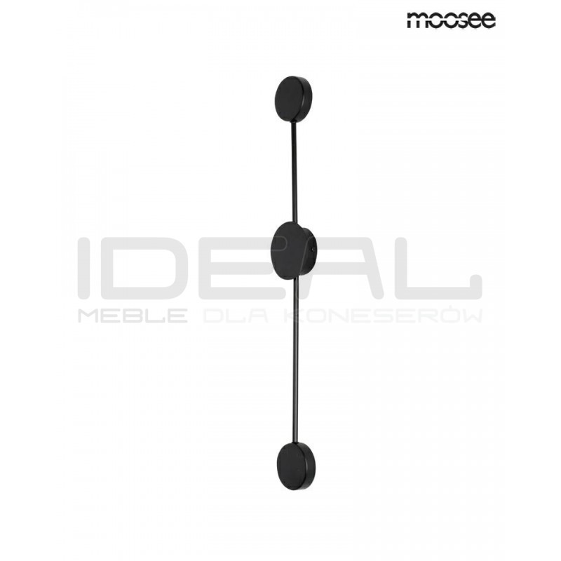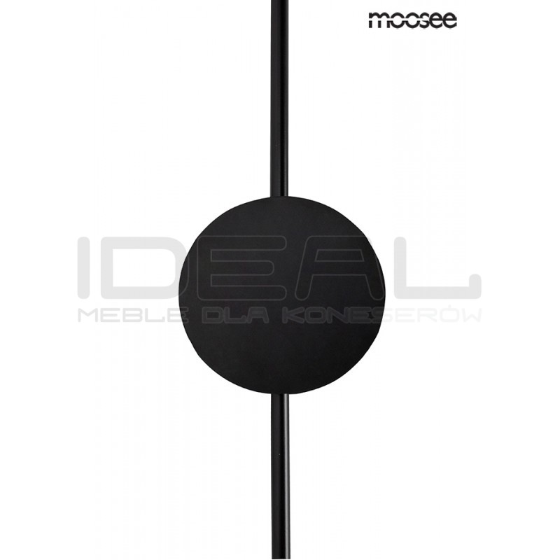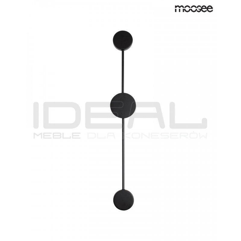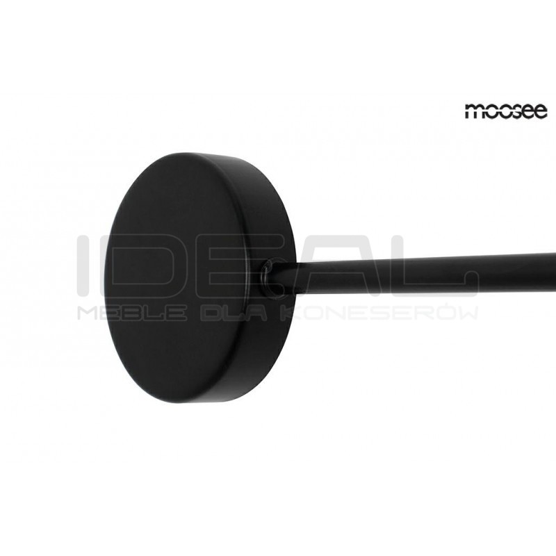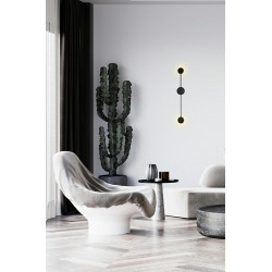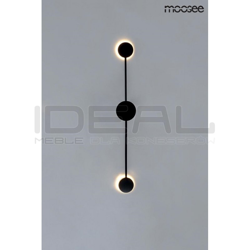 Dzięki swojej formie idealnie wykorzystuję grę światła i cienia. W całości wykonany jest z metalu w czarnym, matowym kolorze. Okrągłe klosze skrywa źródło światła. Dzięki zastosowaniu metalu, światło jest skierowane w kierunku sufitu, ściany. Całość tworzy efekt padającego cienia, jednocześnie w przyjemny sposób oświetlając pomieszczenie.