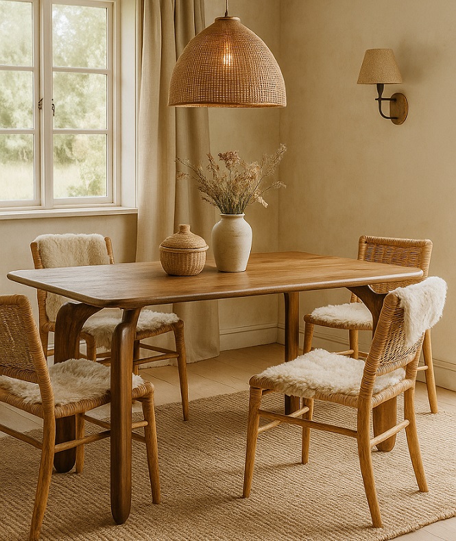 W rustykalnym salonie nie może zabraknąć stołu – najlepiej takiego, który wygląda, jakby służył domowi od pokoleń. Stół z litego drewna, z wyraźnie widoczną strukturą słojów, wprowadza do wnętrza naturalność i szlachetność.