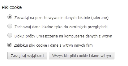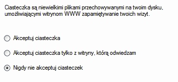 Zaznaczamy opcję Nigdy nie akceptuj ciasteczek (ilustracja poniżej). Klikamy na OK. Zrobione.