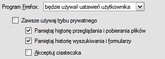 Wybieramy opcję Program Firefox będzie używał ustawień użytkownika, a następnie odznaczamy pozycję Akceptuj ciasteczka (tak jak na ilustracji poniżej). Następnie klikamy na przycisk OK.