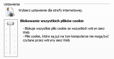 W obszarze Ustawienia przesuwamy suwak maksymalnie w górę (ilustracja poniżej). W ten sposób zablokujemy wszystkie pliki cookies. Klikamy na przycisk OK.