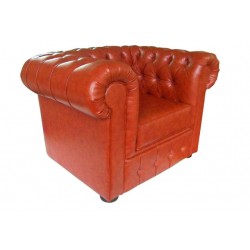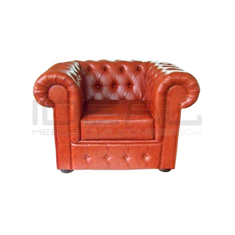 Fotel Chesterfield Ideal w eko-skórze to typowy model chesterfielda, proste przepikowane boki, zakończone charakterystycznym barankiem, głęboko pikowane guzikami oparcie oraz gładkie siedzisko. Całość osadzona na półokrągłych niskich nóżkach, okraszona pinezkami (można wybrać również wersję bez ozdobnych ćwieków).