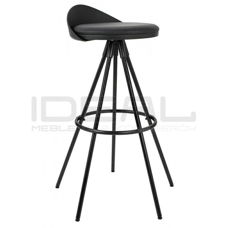 Niskie oparcie i siedzisko z poduszką z ekoskóry idealnie komponują się z długimi, zgrabnymi nóżkami wykonanymi z metalu lakierowanego na kolor czarny. Okrągła obręcz na podstawie oprócz wizualnego aspektu spełnia funkcję wygodnego podnóżka, co zwiększa komfort użytkowania.