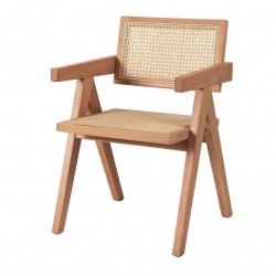 Drewniane Krzesło Boho z podłokietnikami z rattanową plecionką łączy prostą formę z pięknem naturalnych materiałów