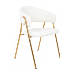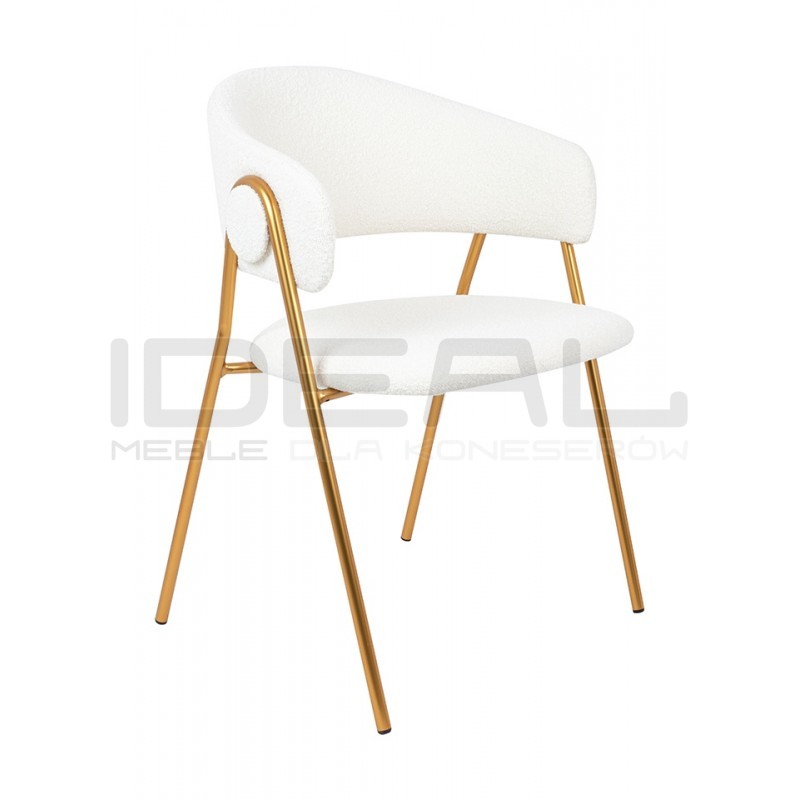 Oparcie i siedzisko krzesła tapicerowane jest przyjemną i miękką w dotyku tkaniną boucle w kolorze białym.