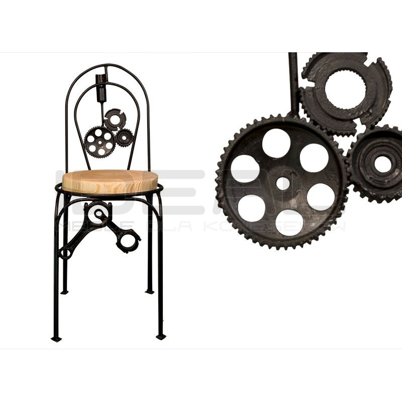 Krzesło Kogwel I sprytnie wykorzystuje koła zębate, okraszając owalny profil pleców krzesła. Dla stonowania całości, przy przednich nogach nie odmówiono sobie dodania metalowych kluczy, wkomponywujących się w ogół.