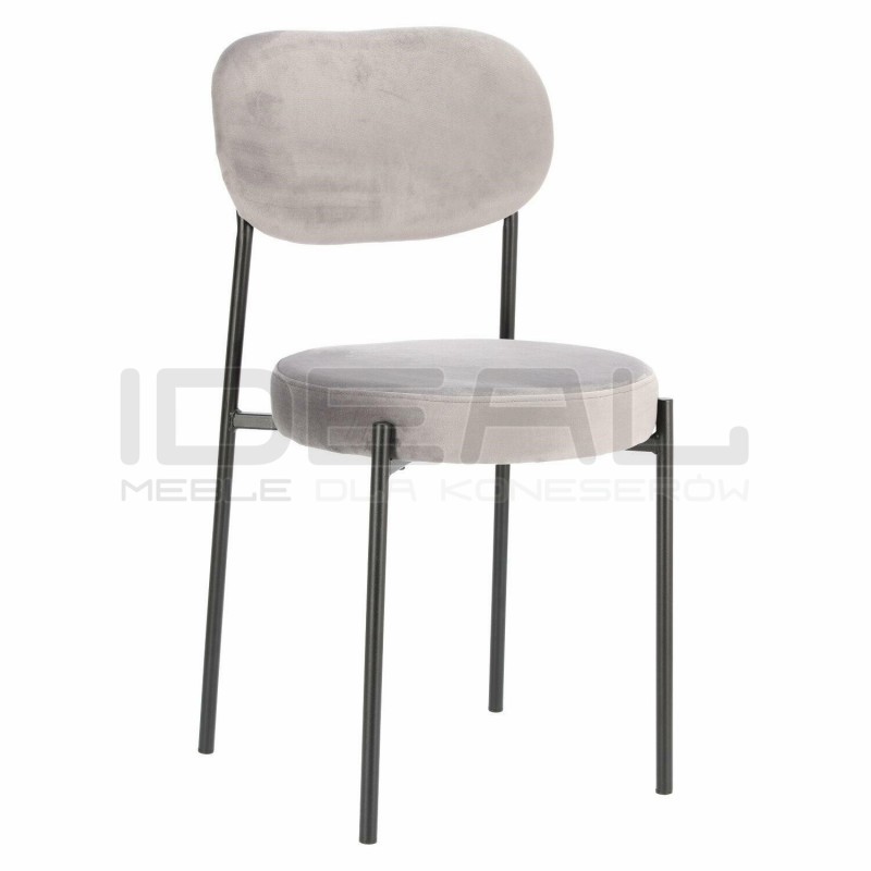 Miękkie siedzisko wypełnione zostało gąbką oraz pokryte tkaniną przypominającą welur, która jest niezwykle miękka w dotyku. Wyprofilowane oparcie to połączenie giętej sklejki i gąbki obite również welurową miękką tkaniną. Siedzisko krzesła spoczywa na metalowym krzyżaku, który łączy ze sobą metalowe, malowane proszkowo nogi.