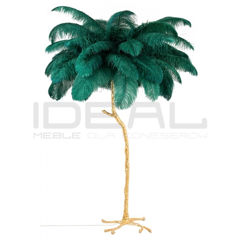 Jej oryginalny projekt został zainspirowany naturą i przypomina kształtem palmowe drzewo, którego liście zostały zastąpione delikatnymi ptasimi piórami. Klosz lampy Tiffany składa się z 45 gęsto ułożonych naturalnych piór strusich o imponującej długości, sięgającej od 55 do 60 centymetrów. Ta niezwykła kompozycja, w połączeniu z miedzianą podstawą w złotym kolorze, zachwyca niezwykłym wdziękiem i niebanalnym stylem.