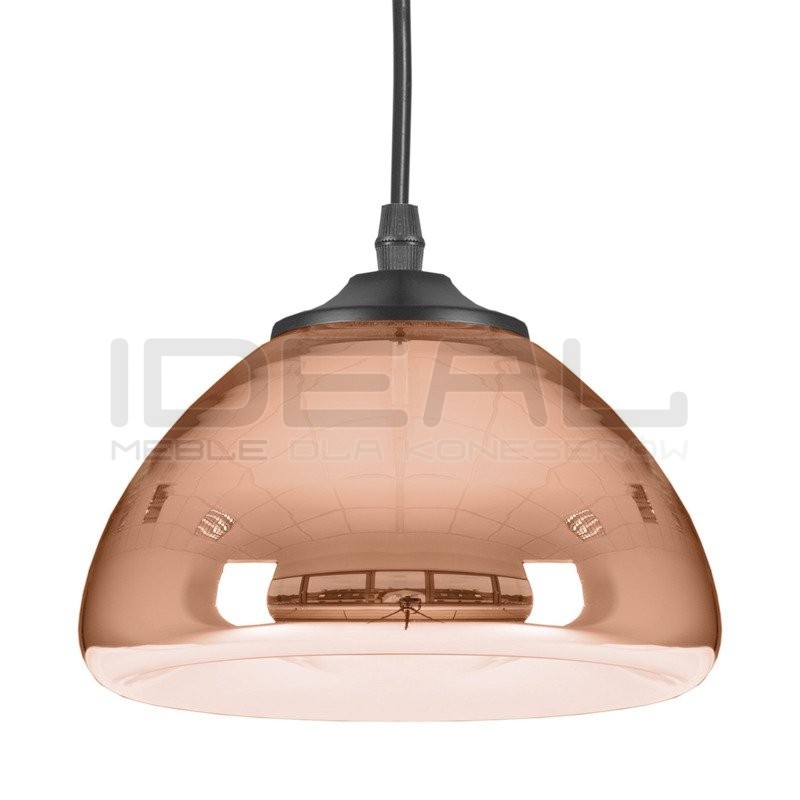 Lustrzana lampa w kolorze miedzianym doskonale komponuje się z drewnianymi meblami oraz ciepłymi barwami, takimi jak brązy czy beże. Jest to kolor, który wprowadza do wnętrza elegancki i ciepły klimat.