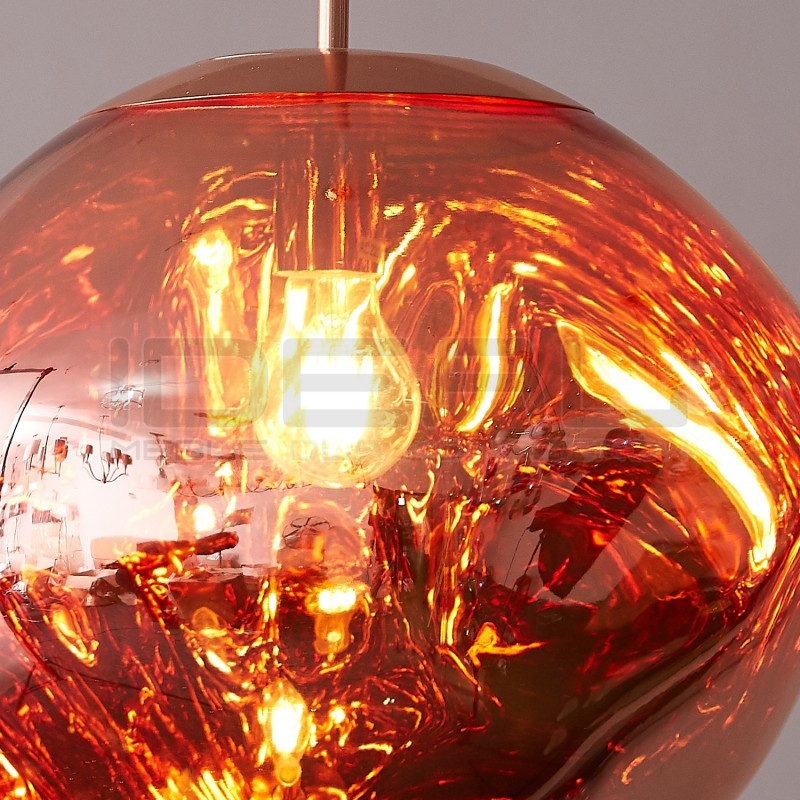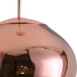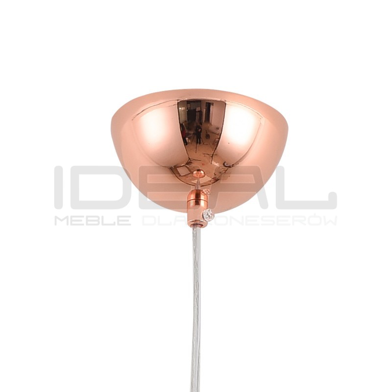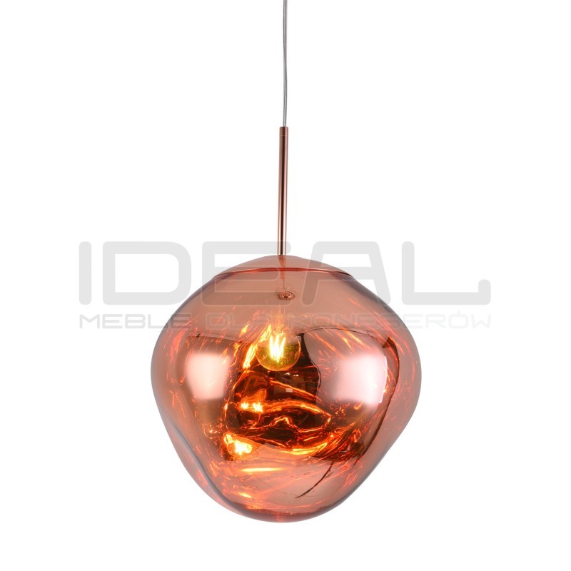 Nieregularny klosz lampy GLAM 28 wykonano z wysokiej jakości akrylu w kolorze miedzianym o lustrzanej powierzchni. Półokrągła rozeta sufitowa w kolorze polerowanej miedzi idealnie współgra z lampą, a lekkości nadaje transparenty przewód. Kolor podsufitki miedziany matowy.