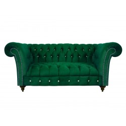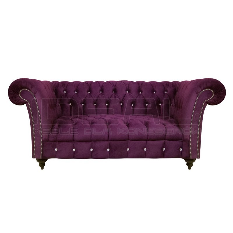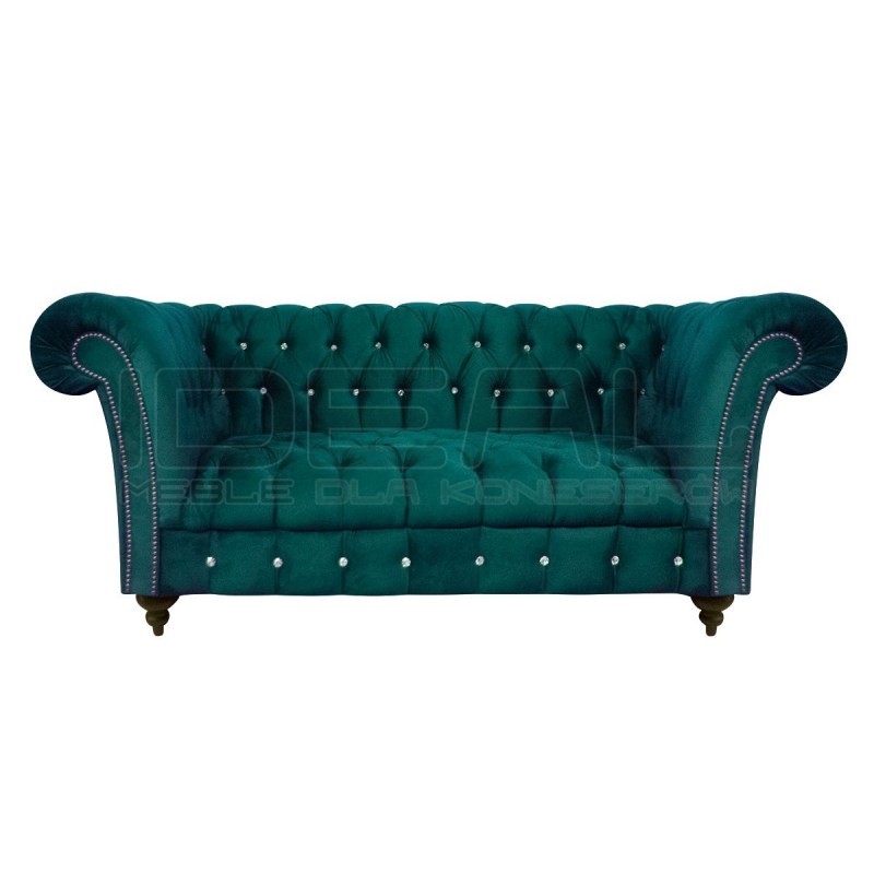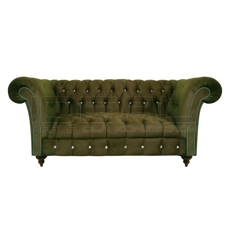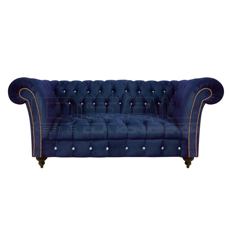 Sofa Elba 2 osobowa z kryształkami to przepięknie pikowana kanapa wykonana w kanonie chesterfield, zachowana w stylistyce glamour. Przepiękne błyszczące złote lub srebrne pinezki oraz guziki kryształowe dodają jej uroku. Sofa posiada drewniane nogi, które na życzenie klienta mogą być metalowe. Zdecydowane kolory sofy będą stanowiły miły akcent we wnętrzu.