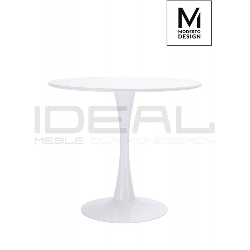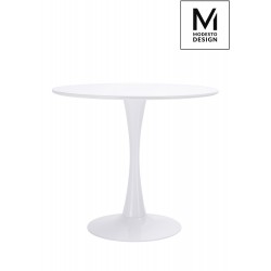 Blat stołu Stół Tulip FI 90 został wykonany z lakierowanej płyty MDF w kolorze białym półmat. Półmatowe wykończenie dodaje elegancji i klasy całości. Blat jest bardzo wytrzymały, dlatego stół jest idealny do wielu różnych zastosowań. W ofercie Modesto Design znajdują się inne meble z serii Tulip w tym stoły i krzesła Tulip.