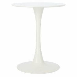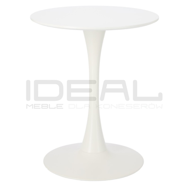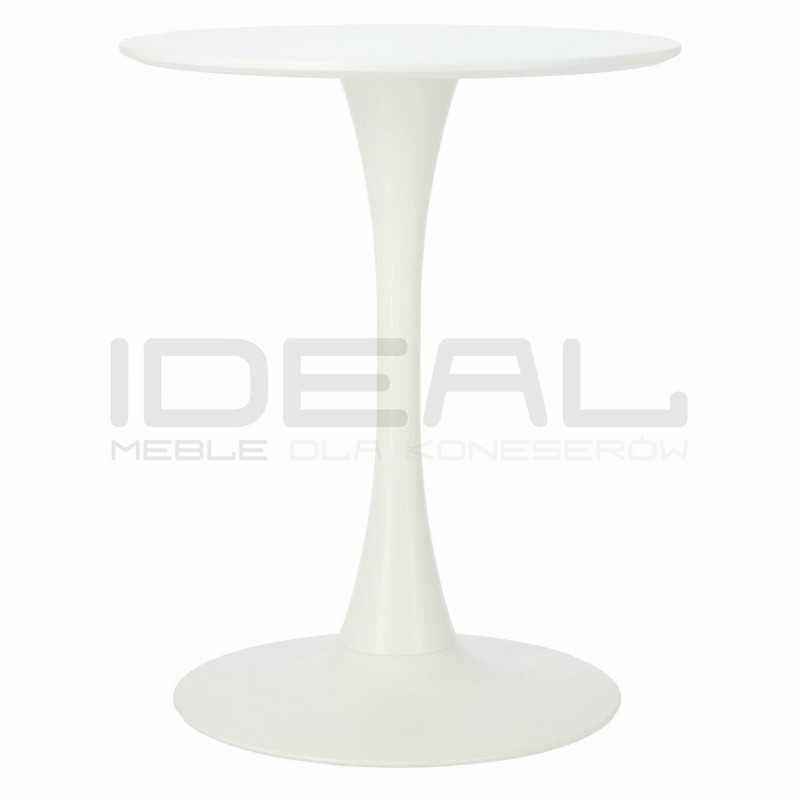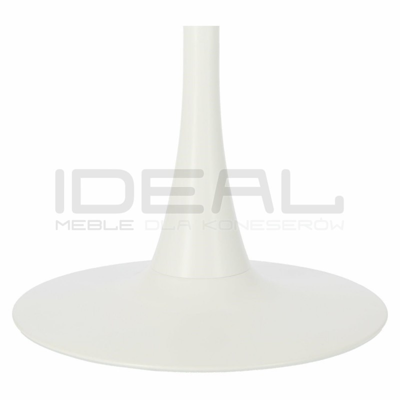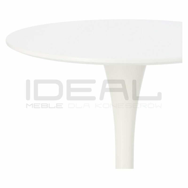 Biały okrągły blat wykonany został z płyty MDF wykończonej na biało lakierem. Dodatkowo podstawę tworzy baza wykonana z metalu malowanego na kolor biały w wykończeniu matowym. Całość tworzy elegancki mebel użytkowy który będzie spełniał swoją rolę przez długie lata.