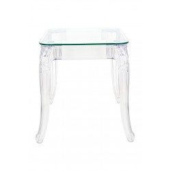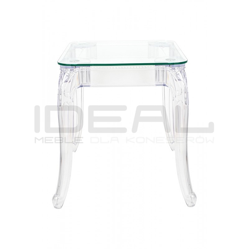 Nogi wykonane są z poliwęglanu, tworzywa lekkiego, lecz bardzo wytrzymałego. Blat stołu zrobiono z grubego hartowanego szkła.